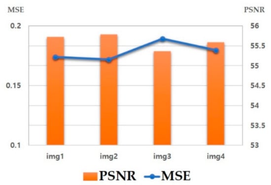 As shown in Figure 8, the MSE was 0.168 and the PSNR was 55.991 dB. Standard deviation was 0.04 for MSE and 1.05 dB for PSNR and the difference in results between the images was small. Table 2 shows the results of MSE and PSNR according to the edge detection method. It was confirmed that adjusting the brightness and contrast increases the function of edge detection according to the image characteristics through the PSNR value. Furthermore, Table 2 lists the PSNR of the different methods. For the dataset used in each paper, “Rena”, “Baboon”, and “Pepper” were mainly used, and the number of pixel arrays that can affect the value of PSNR and the number of datasets used were entered.