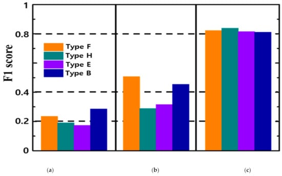 Evaluation result of four images (F1 score): (a) Image without pre-processing; (b) Image with pre-processing before learning; (c) Image with pre-processing after learning.