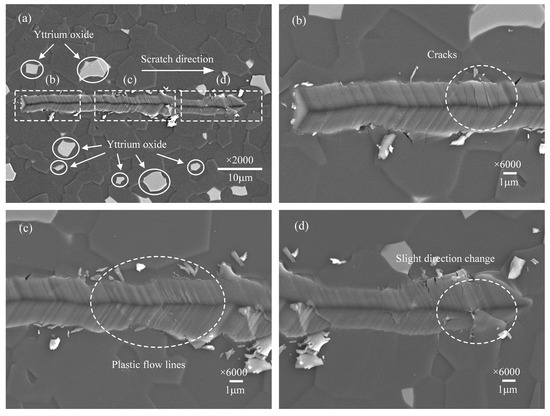 - Higher strain rates would result in shallower penetration depth, less cracks, and indenter fewer slipping. At a scratch speed of 50 μm/s, many distinct plastic streamlines appeared in the scratch groove, indicating that higher strain rates were beneficial to the plastic flow of AlN ceramics.