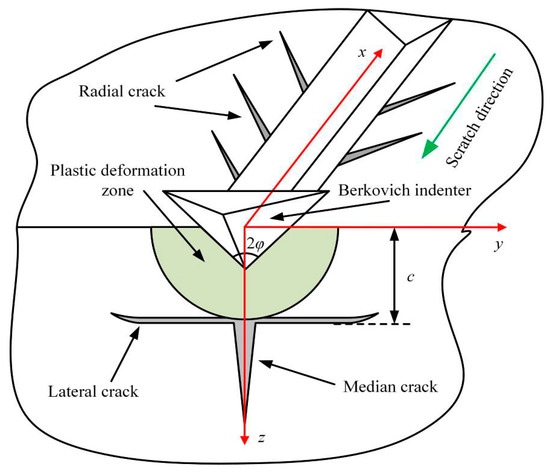 - Jing, X.; Maiti, S.; Subhash, G. A new analytical model for estimation of scratch-induced damage in brittle solids. J. Am. Ceram. Soc. 2007, 90, 885–892. [Google Scholar] [CrossRef]