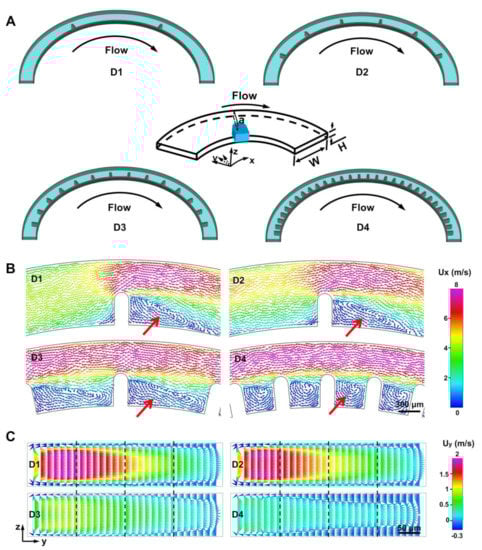 Based on the above analysis, it can be said that the qualitative characteristics and magnitude of two vortexes are significantly influenced by channel construction apart from the Re, serving as key factors to design channel structure for preferable fluid and particle applications. More specifically, the parameters of microchannel construction including the ratio of Dh to R, H/W (H represents the channel’s height and W represents the channel’s width), and the various heights of the inner and outer wall significantly affect the multi-vortex’s distribution and strength [12,13]. However, the strategy for designing geometries for producing multi-vortexes basically focuses on a high-AR expansion–contraction channel, because the weakening of the Dean and helical vortex effect as the height decreases [38]. To better explore the inertia mechanism of the multi-vortex in a low-AR microchannel, a semicircular microchannel with an ultra-low AR (H/W = 100 μm/900 μm) and 6000 μm radius of curvature was developed. In addition to this, the arranged micro-obstacles in the channel (namely a dimension-confined curved channel, D-channel) were set as a dependent regulator to adjust the distribution and magnitude of the multi-vortex. The arranged micro-obstacles are added only to the inner wall of channel which can take better advantage of the Dean vortex generated in the normal semicircle channel for fluid and particle manipulations [37,38]. Four D-channels (D1, D2, D3, and D4) with the same channel length are designed with different amounts of ordered micro-obstacles (2, 6, 14, 30) respectively (Figure 1A). To identify the channel position, we defined a coordinate system (x, y, z), which is the same as that in the previous study on the curved microfluidic system [37,38]. In the designed system, the z-axis points to the roof along the channel depth. The y-axis always points to the channel wall perpendicular to the x-axis, while the x-axis refers to the main flow direction from the inlet to the outlet (Figure 1A). Various distributions of the helical vortex in the horizontal plane (Figure 1B) and the Dean vortex in the vertical plane (Figure 1C) could be produced in the four D-channels (micro-bar length = 450 μm) by numerical simulation. Further investigations of the multi-vortex features in the designed ultra-low-AR microchannels are illustrated in the following.
