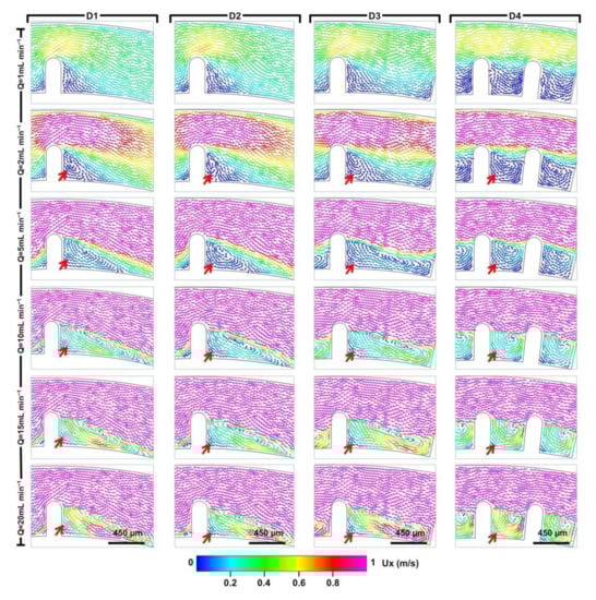 Numerical simulation was further applied to qualitatively study the fluid motion in the four designed D-channels (micro-obstacle length = 450 μm). As shown in Figure 2, at different flow rates from 0 to 10 mL min−1, pronounced helical vortex variations in the horizontal plane were observed with variations of the fluid velocity in the vortex region.