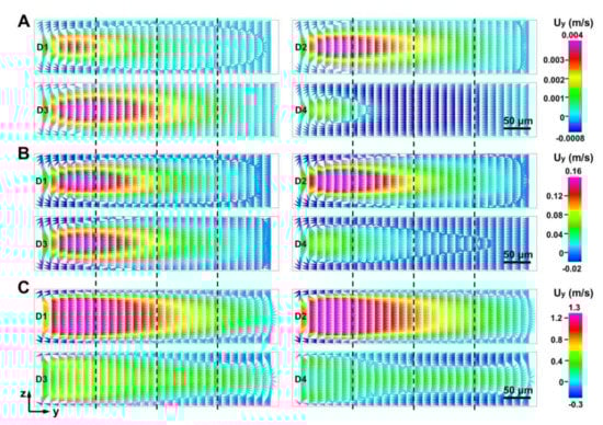 When fluid flowed into the narrow regions of four D-channels (micro-obstacle length = 450 μm), the magnitude and distribution of the Dean vortex in the narrow regions of the four D-channels were different and complex (Figure 3 and Figure 4, and Supporting Information Figure S1). To better distinguish flow dynamics in the D-channels, the cross section was quartered to calculate the simulated velocity field along the border (Figure 1C and Figure 3). The fluid velocity in the y-axis (Uy) and the x-axis (Ux) became higher with increasing operational flow rate (Figure 4 and Supporting Information Figures S1–S3). The Ux values in the D-channels were almost similar at the same given operational flow rate range (0.01–5 mL min−1). However, the fluid velocities in the y-axis (Uy) of the D-channels varied. D4 had the maximum micro-obstacle distributions yet had the lowest Uy. When the flow rate increased to a higher range (10–20 mL min−1), the Ux in the left border of D1 and D2 became slightly higher than those in D3 and D4, yet Ux in the middle and right borders of D1 and D2 were slightly lower than those in D3 and D4. It is noteworthy that the Uy values along borders in D1 and D2 were many times higher than those in D3 and D4 (Figure 4 and Supporting Information Figures S1–S3). D3 had the highest Uy when the flow rates were 0.01–0.5 mL min−1. D2 had the highest Uy when the flow rates increased to 1–5 mL min−1, and D1 had the highest Uy when the flow rates increased to 10–20 mL min−1. The calculated results revealed that the intensity of the Dean vortex could be regulated by controlling the number of micro-obstacles and the operational flow rate. As the flow rate increased, reducing the number of micro-obstacles in the D-channels significantly promoted the Dean vortex in the narrow cross section. However, the resulting reduction in the number of Dean vortexes negatively affected fluid manipulations. Accordingly, it is vital to yield the optimal number of micro-obstacles and flow rate when studying fluid applications [16,17]. These findings verify the value in using sequenced micro-obstacles in curved channels to modify the Dean vortex achieved and lay the theoretical basis for fluid mixing and particle manipulation [37,38]. Further studies on the responses of multi-vortexes to micro-bar length and AR alteration based on the device are presented in subsequent sections.