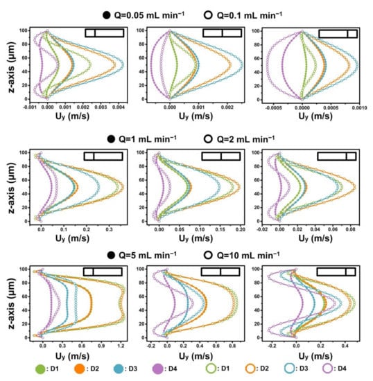 Quantitative analysis of fluid velocity along channel cross sections in narrow regions of different D-channels under different flow rates (0.05 to 10 mL min−1). The partial results correspond to the dotted lines in Figure 3.