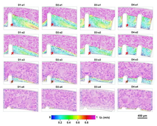 More obvious curvature radius variation from the wide (6000 μm) to narrow (6090 μm representing a-4; 6270 μm representing a-3; 6450 μm representing a-2; 6630 μm representing a-1) regions are likely to accelerate the Dean vortex in the narrow region significantly [37]. Furthermore, the intensity of the Dean vortex could be adjusted by controlling the number of micro-obstacles when the micro-bar lengths were 270, 450, and 630 μm. Shorter micro-obstacles (length = 90 μm) in the D-channels (NR = 810/900 (D1-a4, D2-a4, D3-a4, D4-a4)) could not induce an organized Dean vortex distribution. These results demonstrate the intensity of the helical vortex and that the Dean vortex can be adjusted by regulating the confinement degree. From the above results, the NR (namely, micro-bar length) can serve as an effective factor for adjusting the magnitude of the multi-vortex in curved channels.