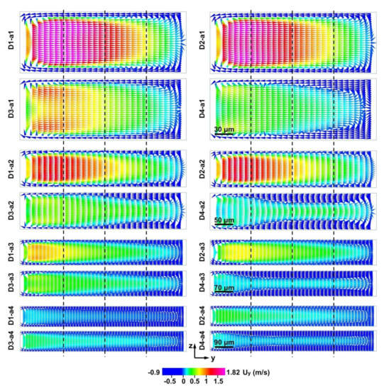 Moreover, Ux showed minimal difference among the narrow regions with the same width (a1, a2, a3, a4) in the different D-channels when fluid entered the narrower regions under identical initial flow rate (15 mL min−1) (Supporting Information Figures S4 and S5). However, the Dean vortexes in the narrow regions of the D-channels were notably different (Figure 6). The Uy in the narrow regions increased with decreased NR in the D-channels (Figure 6 and Figure 7). This result demonstrates that the micro-obstacle installation brought about a noteworthy acceleration of the Dean vortex.