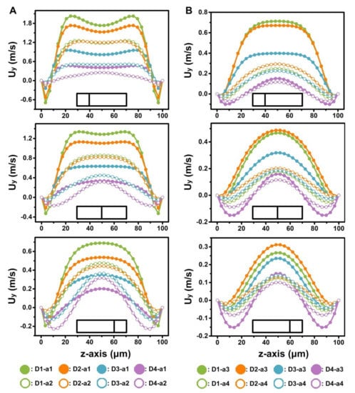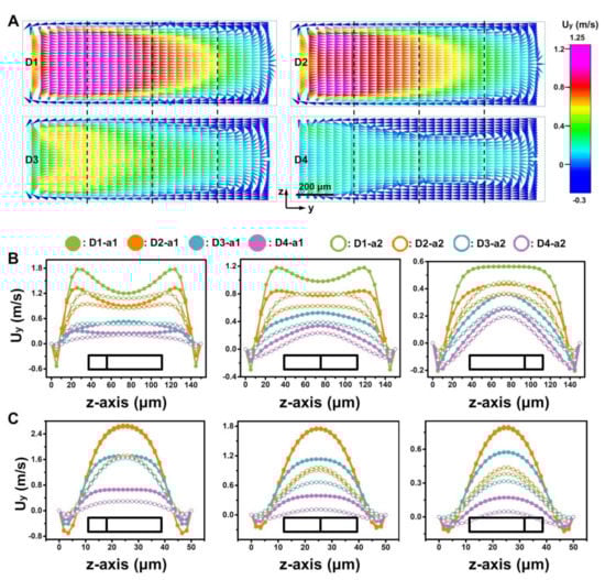 (A,B) Quantitative analysis of fluid velocity along channel cross sections of D-channels (D1, D2, D3, D4) with different widths of the narrow regions (a1 (A), a2 (A), a3 (B), a4 (B)) at a flow rate of 15 mL min−1. The results correspond to the solid lines in Figure 6. a1, a2, a3, and a4 represent 270, 450, 630, and 810 μm widths of the narrow regions in Figure 1A respectively.
