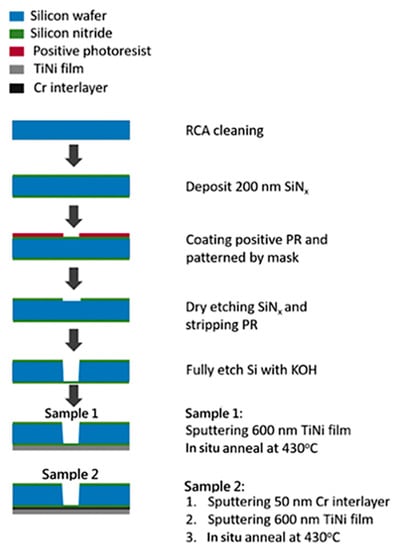 In particular, the impact of third-element adhesion materials is a point of interest. In order to enhance adhesion [], very thin adhesion layers can be applied between the substrate and the metal films. The most used adhesion metals are Ti and Cr, however, the advantages and disadvantages of the individual materials as adhesion layers between TiNi SMA films and Si/SiNx substrate arepoorly understood. For example, Ti and Cr are commonly used as a simplified adhesion layer in the micro and nanofabrication field. They are known to be more chemically reactive than noble metals, and thereby increase the adhesion as they chemically bond to the substrate. However, the addition of a third element that could replace Ni and/or Ti has a substantial effect on the phase transformation behavior in TiNi alloys. As a result, the addition of Cr has attracted a lot of attention because it not only adjusts the transformation temperature [], but also leads to the improvement of mechanical properties such as yield stress [], torque capacity and rigidity [], and fatigue life [].