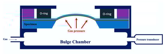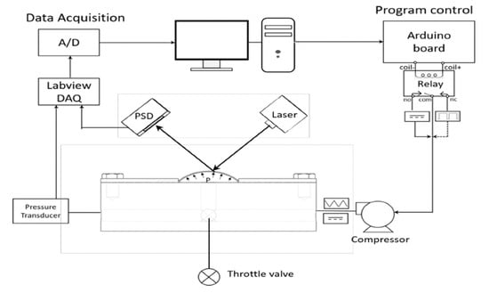 The construction of the bulge system is shown in the diagram in Figure 3. The experimental processes are illustrated in Figure 3. The system was mainly divided into a signal acquisition unit and an output control unit. The details of the bulge system setup can be found in our previous paper []. Figure 4 shows the details of how the bulge system was arranged with a pressure chamber. The bulge specimen was tightly clamped on top of the pressure chamber with O-ring fasteners. After the sample was sealed, the gas was pumped into the pressure chamber to provide the pressure for the bulge membrane. The bulge height was measured with a position sensing detector (PSD). The signal acquisition unit was received primarily by the NI-Data Acquisition (DAQ) box through a pressure transducer and a PSD, which returns the voltage signal. The control unit used the Arduino single-chip controller to regulate the electromagnetic relay using Arduino’s integrated development environment (IDE) open-source program. By changing the voltage signal in the air compressor, it was able to produce different pressure modes.