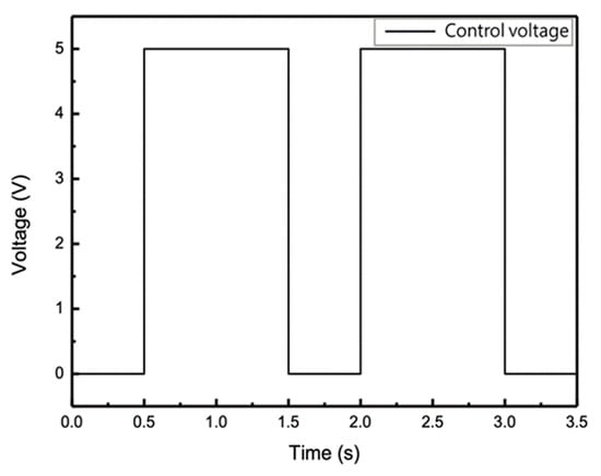During the fatigue test, we used Arduino Uno software (Board Model UNO R3, Arduino IDE 1.8.13, Ivrea, Italy) to control the compressor, this provided the initial setting of a constant pressure of 2.5 KPa for the bulge specimen to provide a mean stress of 300 MPa, and then the Arduino IDE program was used to control the relay switch of a pulse signal with a frequency of 0.67 Hz by changing the voltage signal in the air compressor; therefore, this was able to produce a different stress amplitude of 25 MPa from the pressure modes as shown in Figure 5. The fatigue program produced an air compressor output with a triangular waveform and a pressure range of 9.5~12 KPa, as shown in Figure 6 and stress after conversion was equivalent to 300 ± 25 MPa. In order to study the material properties of the samples before and after the fatigue tests, all the samples were set to be tested at fatigue cycles of 5 × 104 to maintain the sample’s integrity before its fatigue limit for further study.