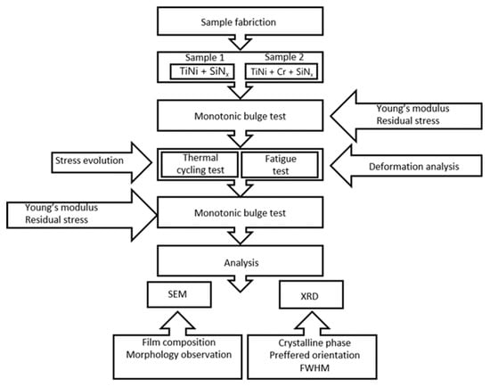 As shown in Figure 1, the sample fabrication process has six steps. A <100>, 4 inches, double-sided polished 250 μm silicon wafer was used. The first step involved cleaning the wafer with RCA, which is commonly used to remove organic residues on silicon wafers, and depositing a 200 nm SiNx layer on the wafer through low pressure chemical vapor deposition (LPCVD). After deposition, the pattern was defined by lithography process technology; then, the wafer with the photoresist was placed in the inductively coupled plasma (ICP) for dry etching to remove the pattern not protected by the photoresist. Next, the SiNx layer was transformed into a floating membrane structure through wet etching. Finally, the bulge specimen shown in Figure 2 was produced by using the PVD process to deposit SMA thin films on top of the membrane. Two kinds of specimens were produced: one SMA deposited on SiNx only (Sample 1), and another SMA deposited on SiNx and a 50 nm Cr adhesion layer (Sample 2).