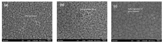 Cross-sections of the films obtained through SEM: (a) Unannealed; (b) Specimen 1; (c) Specimen 2.