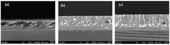 Figure 9 presents the cross-sections of the films, showing the TiNi upper layer and the SiNx lower layer. It can be seen that the unannealed TiNi film (Figure 9a) had no obvious change in microstructure, and that Specimens 1 (Figure 9b) and 2 (Figure 9c) had clusters of columnar crystals between the layers of the entire film. Additionally, the film containing the Cr bonding layer (Specimen 2) had a more uniform structure than Specimen 1. This is probably because Specimen 2 achieved better migration in the growth process, allowing the particles to grow and merge uniformly; thus, the stratification of Cr and TiNi cannot be clearly seen. Moreover, it can be speculated that the Cr might have been diffused into the interior of TiNi during heating.