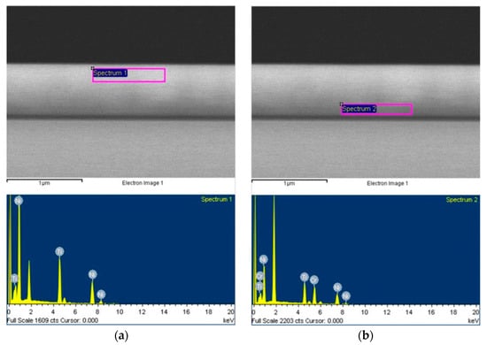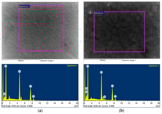 Surface composition analysis by EDS: (a) Specimen 1; (b) Specimen 2.
