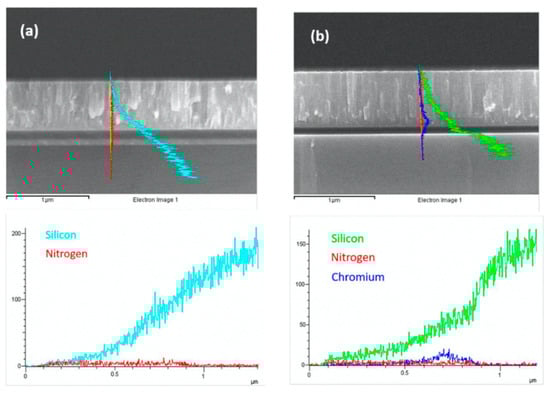As shown in Figure 12, the SiNx layer blocked most of the Si diffusion, and the specimen containing the Cr intermediate layer had a lower content of Si and N; therefore, it can be inferred that the blocking diffusion effect is better in SiNx only. The barrier layer prevented Ti, Ni, and Si from forming a brittle compound with N.