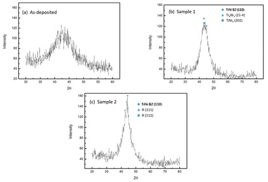 The SMA effect only occurs in the crystalline state, however, the TiNi film sputtered at room temperature is amorphous, and thus it needs to be post annealed (usually at higher than 500 °C) to recrystallize it into a B2 phase structure. Previous studies have pointed out that if the film is deposited at a higher temperature (about 400 °C), this is sufficient to form a crystalline phase [], so, in this experiment, a synchronous heat of 430 °C was used for annealing (in situ anneal) using the PVD system. The substrate temperature was maintained at 430 °C during the post-coating process to eliminate the need for subsequent high-temperature recrystallization annealing, which allowed the TiNi film to retain its crystalline state.