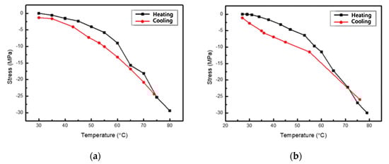 Temperature-stress evolution diagram of TiNi film: (a) Specimen 1; (b) Specimen 2.