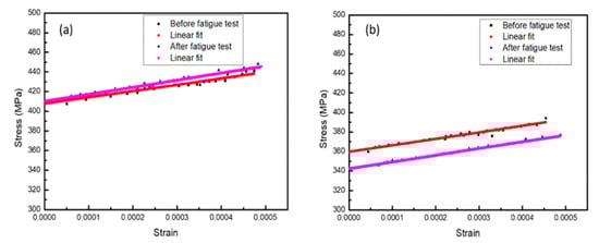 Change in mechanical properties before and after the fatigue test: (a) Specimen 1; (b) Specimen 2.