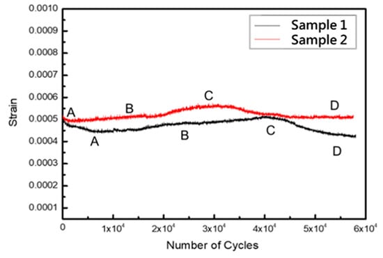 During the tests, the membrane was bulged up for loading and down for unloading. Therefore, the axial strain on the long side of the rectangular window can be regarded as zero, the short side at both ends can be assumed to be free-end, and the film is only subject to the uniaxial tensile force of the long side, so, only the measurement on the axis strain () can be measured. The ratchet strain of cyclic load is depicted in Figure 18, from which it can be seen that the first several cycles (A) had rapid hardening, which gradually softened to a stable state (B) after reaching a peak. In this stage, the increase in dislocation density and entanglement reduced the dislocation motion ability, demonstrating the hardening phenomenon. Among them, Specimen 1 without a Cr adhesion layer went through more cycles before reaching a stable state and there was an apparent softening phenomenon in Specimen 2. After several cycles, it started to produce a hardening phenomenon (C). Moreover, Specimen 1 showed severe hardening while Specimen 2 showed no noticeable change (D).