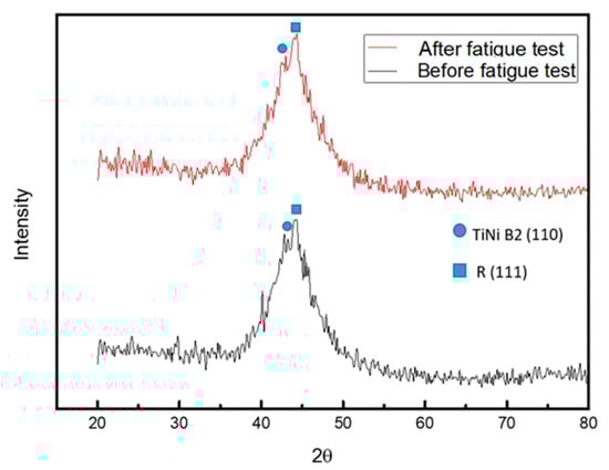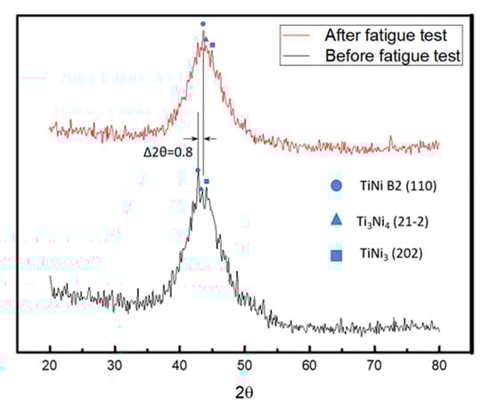In the unannealed specimen phase diagram (see Figure 13a), it can be seen that there was a broad diffraction peak around 2θ of about 42°, which is the XRD characteristic of the amorphous TiNi. Therefore, SMA was not present in the unannealed TiNi specimen at normal temperature.