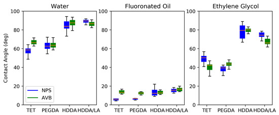 Contact angles for various fluids (water—polar; fluorinated oil—non-polar; ethylene glycol—mildly polar) and polymer combinations; n ≥ 6; error bars are 95% confidence intervals.
