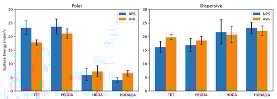 These contact-angle measurements were used to calculate the surface energies of the printed polymers according to the methods in [26,27], each of which illustrates the origins and use of the Owens/Wendt theory for calculating surface energy using a two-component model. This theory divides the total surface energy into polar and dispersive components. The model is shown in Equation (1), which includes the contact angle () for the given fluid on the solid material as well as the overall, polar, and dispersive energies of the fluid (,,), which are reported in the references cited above.