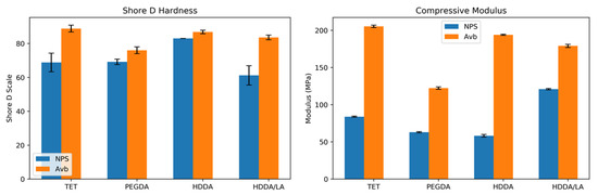 We reported a preliminary evaluation of the mechanical properties of 3D-printed N-PEGDA resin in a previous publication [15]. Herein, we directly compare the compression modulus and hardness of our four monomer resin formulations for both the AVB and NPS 3D UV absorbers, as shown in Figure 3. Note that there is a clear difference in the compression modulus for resins with NPS and AVB UV absorbers, with the AVB UV abvsorber resulting in a substantially higher compression modulus for each monomer formulation. We consider it likely that this is due to the need for a much lower concentration of AVB (0.38%) compared to NPS (2%) to achieve the same optical penetration depth, which is the primary determinant of the z-resolution of a 3D print; i.e., a reduced concentration of small absorber molecules may facilitate a greater degree of crosslinking in the polymer matrix during 3D printing.