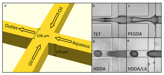 (a) 3D-printed microfluidic droplet generator. On the right (b–e) are shown simple pinch-off geometries built with A-TET, N-PEGDA, A-HDDA, and A-HDDA/LA. Oil flows were from top and bottom to the left. Channels were 106 m across and 110 m tall.