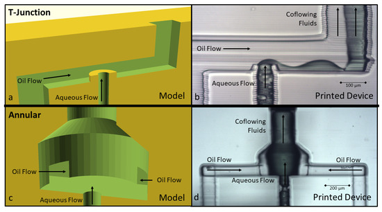 Cross section of the modeled and printed versions of 3D T-junction (a,b) and annular flow-focusing (c,d) geometries. Both geometries resulted in co-flowing streams where droplets did not form.