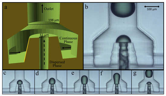 A successful droplet generator made from the hydrophilic A-PEGDA polymer was developed by elevating the outlet of the dispersed phase in the annular flow-focusing geometry in Figure 5c (see Figure 6), referred to as an annular channel-in-channel (ACC) geometry. This ACC geometry directs viscous forces by limiting the possible contact area between the aqueous phase and the polymer after exit from the aqueous channel in the annular region at the top of the pedestal. Video S2 in the supplementary material shows stable droplets being formed using the ACC geometry. As Figure 6c–g show, the aqueous flow is still attached to the hydrophilic polymer at the raised outlet, and the droplet is formed by forcing the dispersed phase fluid to expand and disconnect from the flow channel without allowing for the dispersed (aqueous) phase to contact the hydrophilic polymer beyond the top of the annular pedestal. Using this geometry, droplets were formed that were consistent in size and stable through the downstream flow channels.