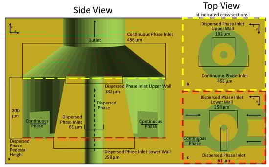 Cross sections and dimensions for annular channel-in-channel geometry shown in Figure 6. (a) shows an XZ cross section of the ACC geometry with the relevant dimensions and inlet locations of the dispersed and continuous phase flows. (b,c) show two different XY cross sections at upper (b) and lower (c) locations on the ACC droplet generator.