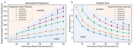 Generation frequency (a) and droplet size (b) associated with the ACC geometry for various flow rates for the dispersed and continuous phases. Flow rates for the continuous phase (vegetable oil) too far below those for the dispersed phase (water) resulted in unstable flow. Individual data points represent single experiments.