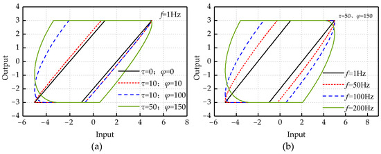 Figure 1a shows that, at the input frequency f = 1 Hz, the width of the Delay Play operator increases with the increase of τ and φ. The rising and falling edges of the Delay Play operator change from a straight line to an arc, and the curvature of the inflection point of the operator curve increases with the increase of τ and φ. As shown in Figure 1b, with the increase of the input frequency, the width of Delay Play operator is also increasing when τ and φ remain the same.