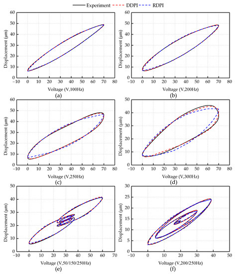 By predicting the displacement of the platform, the performance of the DDPI model and the Rate-Dependent Prandtl–Ishlinskii (RDPI) model [35] to describe the hysteresis of the dynamic and asymmetry of the piezoelectric actuator is analyzed.