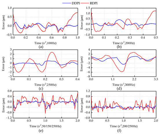 To compare the fitting performances of the two hysteresis models to different experimental curves more clearly, Figure 5 shows the fitting errors of the two hysteresis models. In the model fitting of the 100 and 200 Hz single frequency experimental curves and the first multi-frequency experimental curve, the two hysteresis models describe the asymmetrical and dynamic characteristics of the piezoelectric actuator accurately. In the model fitting of the 250 and 300 Hz single frequency experimental curves and the second multi-frequency experimental curve, the fitting performance of the RDPI model is worse than that of the DDPI model. It can be found from the fitting conditions that the RDPI model has insufficient description of the higher frequency dynamic hysteresis curve. This is mainly reflected in the insufficient description of the inflection point of the hysteresis curve by the RDPI model. The RDPI model presents the straight-arc curve, which is inconformity with the arc of the inflection point on the high frequency hysteresis curve. When predicting different experimental displacements, the performance of the DDPI model is mostly consistent. In the comparison of two groups of multi-frequency experiments, it can be clearly found that the DDPI model has a better performance to describe the minor loop, while the RDPI model still has a larger error in describing the minor loop.