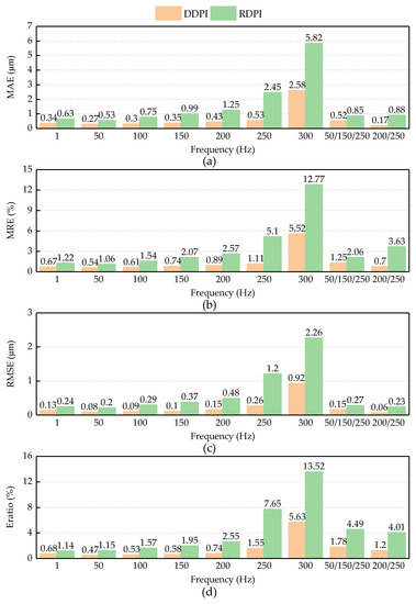 Figure 6 shows the evaluation results of the two models. The two hysteresis models can describe the hysteresis curve accurately at low frequency. The MRE of the DDPI model is less than 1% at 1–200 Hz and second multi-frequency experiments. When the frequency of the single frequency experiment is 250 Hz, the MRE of the DDPI model is less than 2%. The MRE of the DDPI model is less than 2% in the first multi-frequency experiment. The MRE of the RDPI model is more than 1% in the nine kinds of experiments. After the frequency of input signal is greater than 100 Hz, the MRE of the RDPI model exceeds 2%, and the description error is up to about five times compared with the DDPI model. However, when the input frequency is 300 Hz, the performance of the DDPI model decreases. However, the MRE of the DDPI model is still less than half that of RDPI models with MRE over 10%. It can be seen from different evaluation standards that the accuracy of the RDPI models decreases as the frequency increases on the whole. The DDPI model has a consistent performance on predicting different experimental displacements and the MAE of the DDPI model is less than 0.6 μm except 300 Hz. The RMSE of the DDPI model is less than 1 μm. However, the RMSE of the RDPI model exceeds 250 μm at 1 Hz and exceeds 2 μm at 300 Hz. On describing the same experimental curve, the accuracy of the DDPI model is higher than that of the RDPI model and the error is basically reduced by more than 40%.