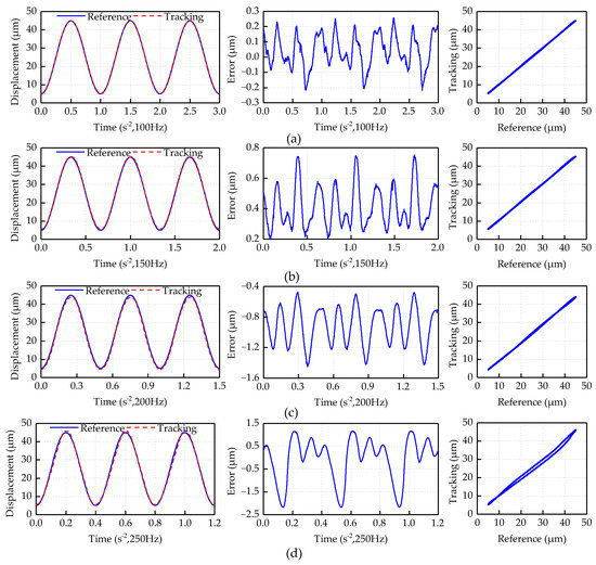 Figure 8 shows the experimental results of feedforward compensation for the single frequency sinusoidal signals. The expected displacement is set as yd(t) = 20sin(2πft − π/2) + 25. The experimental results show that the inverse compensator can effectively suppress the asymmetrical and dynamic hysteresis of the piezoelectric actuator. The maximum absolute values of positioning error are 0.26, 0.75, 1.45 and 2.18 μm within 100, 150, 200 and 250 Hz, respectively. In the tracking experimental results with frequency of 100, 150 and 200 Hz, the reference trajectory and the tracking trajectory can mainly show a linear relationship. In the tracking experimental results with frequency of 250 Hz, the compensation performance of the inverse compensator has decreased. The nonlinear error of the 250 Hz experimental curve is reduced from 36% to 5.0% after compensation.