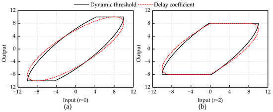 Compared with the RDPI model, the DDPI model has a better performance on fitting the asymmetrical and dynamic hysteresis. In the above experimental results, it is found that the larger fitting error of the RDPI model is mainly concentrated in the inflection point of the experimental curve. To further explore the difference of the description performance of different models, two simulations of the Dynamic Threshold Play operator and the Delay Play operator are set up. The input signal is set as u(t) = 10sin(20πt) and the threshold is set as r = 0, 2. Figure 10 shows the results of two simulations. Under different thresholds, there is always a horizontal line at the top of the Dynamic Threshold Play operator, and there is a peak between the line and the arc. This is more difficult for the RDPI model to describe the smooth inflection point of experimental curve. When the threshold is 2, the inflection point of Delay Play operator also shows the shape of arc. Moreover, when the threshold is 0, the Delay Play operator presents the shape of an ellipse. These are reasons that the DDPI model can describe dynamic characteristics of the piezoelectric actuator accurately.