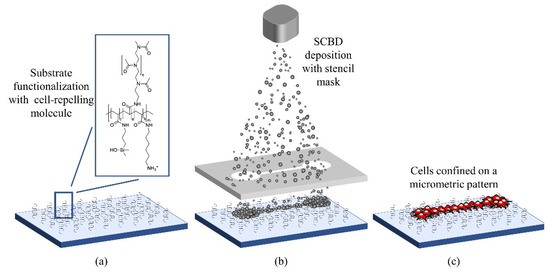 The main steps for substrate fabrication are summarized in Figure 1: (a) an anti-fouling molecule is grafted to the surface of a glass substrate, (b) a nanostructured zirconia coating is deposited via SCBD through stencil masks, to create the cell-adhesive regions, and (c) the result is a selectively antifouling substrate where cells attach only on the adhesive areas.