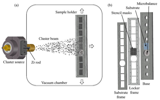(a) Schematic representation of the SCBD apparatus (not to scale): the cluster beam is produced by the pulsed microplasma cluster source (PMCS) equipped with a zirconium rod and it impinges on the sample holder. By rastering the sample holder, a patterned film is deposited on all the samples. (b) Design of the sample and stencil mask holder. The three parts ensure the right positioning of the stencil masks with respect to the deposition substrates.