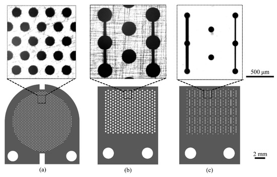 We used stencil masks fabricated with two different techniques: laser cutting (LC) of thin stainless-steel foils and photo-resist lithography (PRL) of silicon wafers. Different pattern designs were evaluated (sub-millimetric dots with or without micrometric channels), and some examples are reported in Figure 3. LC steel masks with dots were purchased from Lasertech Srl (Cernusco sul Naviglio, Milan, Italy), and LC steel masks with dots and micrometric channels were obtained from Kirana Srl (Rovereto, Trento, Italy). The detailed characteristics of the masks with the main features of the stencil patterns are listed in Table S1 of the Supplementary Information.