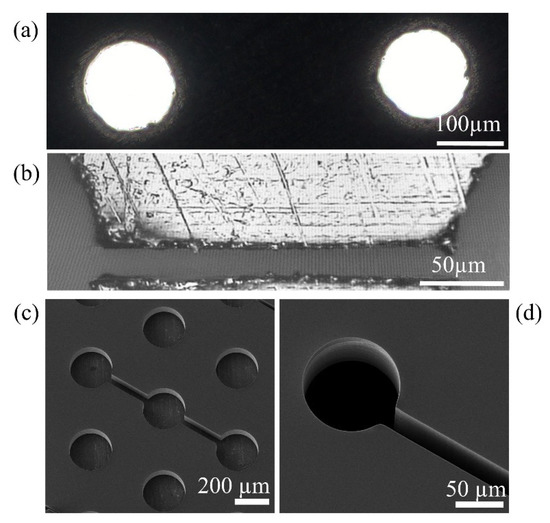 Details of stencil masks produced with LC of stainless-steel foils and with photo resist lithography (PRL) of silicon. (a) Optical micrograph of 150 μm wide holes of LC steel mask with jagged borders (mask A, Supplementary Table S1). (b) Optical micrograph of a 20 μm wide channel of LC steel mask with a re-solidified drop of metal closing-up the channel opening (mask Q13, Supplementary Table S1). (c) SEM image of 250 µm wide dots with an interaxial distance of 500 µm. The channels connecting the dots are 50 µm wide (mask Q19, Supplementary Table S1). (d) SEM image of 100 µm wide dot with a 20 µm wide channel (mask Q16, Supplementary Table S1). Images (c,d) were acquired using a SEM (VEGA3 TESCAN) with a 10 kV electron beam at different magnifications.