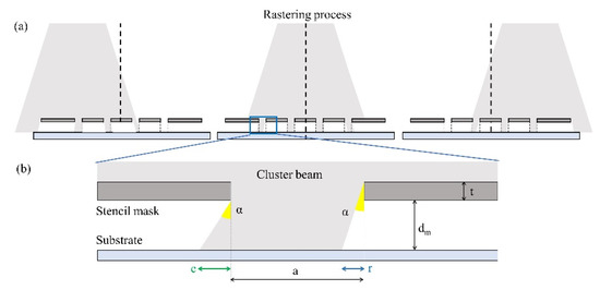 Schematic representation of a beam passing through a stencil mask and impinging on a substrate. (a) Rastering process: three different source–substrate relative positions are displayed, in which each opening intercepts a portion of the beam with a different inclination. (b) Single mask opening of extension a. A portion of the cluster beam passes through a stencil mask of thickness t with angle α and impinges on a substrate at a distance dm from the mask. Due to the non-zero inclination of the beam with respect to the normal to the substrate plane and the presence of a gap between the mask and the substrate, the beam overcomes the pattern borders, producing an enlargement e. Also, the right side of the pattern is not completely covered, causing a reduction of extension r in the deposition.
