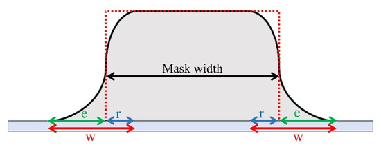 Figure 6 reports the height profile of a patterned film resulting from a perfectly focused cluster beam, where the transverse velocity component of each cluster is negligible (red dotted line), and one resulting from a beam with clusters of different transverse velocities (black, continuous line). The blurring effect consists of both an enlargement of the pattern feature overcoming the borders of the stencil mask holes, in Figure 6 indicated with e, but also of a reduction in the thickness of the layer deposited close to the borders of the stencil mask holes, indicated by r. The sides of the latter have a shape that reflects the distribution of the transverse velocities of the clusters. The rising width w of the profile is given by the sum of the enlargement e and the reduction r.