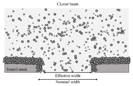 Figure 5 reports a schematic representation of the deposition process. In the different source–substrate relative positions (Figure 5a), the inclination of the portion of the beam intercepted by each stencil mask opening varies. Figure 5b focuses on one opening of the stencil mask and highlights how the cluster beam overcomes the area under it, due to the non-zero distance between the mask and the substrate and to the inclination of the cluster beam.