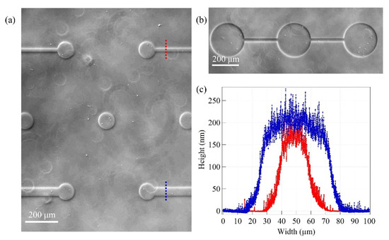 When the width of LC steel mask’s opening is of a few tens of micrometers, the effect of the edge defects becomes more relevant. This is particularly evident, for example, in the pattern given by dots connected by 20 μm wide bridges. The width of the border of the micro-bridges has wiggles of dimensions comparable to the bridge width, therefore the topography is severely affected (see Figure S3 in the Supplementary Information). Defects like consistent wiggles and interruptions in channels were found to affect between 40% and 70% of the channels in each mask.