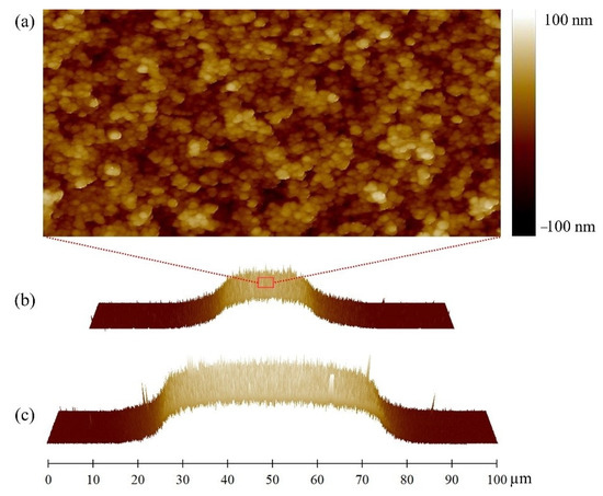 Figure 9 shows the AFM images of the nanostructured zirconia of micrometric bridges characterized by different widths (20 and 50 μm). As mentioned before, when the width of the mask channel is comparable to the dimension of the lateral height gradient of the nanostructured zirconia bridge (as is the case for the 20 μm wide bridge), the highest thickness of the deposited film, characterizing the central plateau, is lowered due to the blurring effect.