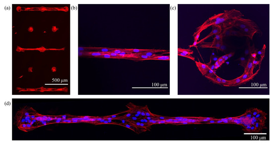 In Figure 10a, a low-magnification image shows the actin cytoskeleton of cells in different confinement configurations, i.e., on triplets of dots connected by 20 and 50 μm wide bridges, and on isolated dots. Astrocytes grow only on the adhesive patterned areas and remain confined both on the single dots and on the interconnected triplets of dots. The images in Figure 10b, c show details of pattern features, a 20 μm bridge and a dot of 250 μm diameter, respectively. The image in Figure 10d was obtained by stitching together several 10× images (using the grid stitching plugin of ImageJ, NIH, New York, NY, USA).