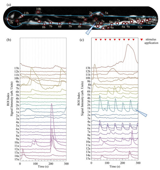 The stimulus consisted in the delivery of a droplet of glutamate solution every 30 s (the pressure application device was triggered every 30 s for 50 ms, thus delivering droplets of equal volume < 4 pL), and in the graph, this is indicated by the red triangular markers. In both graphs, the traces are ordered following the position of each ROI with respect to the direction parallel to the bridges, from left to right. The triangle representing the micropipette is reported in Figure 11c, between the traces of ROIs 1a and 1b, corresponding to the two cells closer to the stimulus.