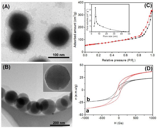TEM images of (A) magnetic beads and (B) the aminated magnetic mesoporous silica nanocontainers (inset: the corresponding high-resolution TEM image with 1.5-fold magnification); (C) nitrogen adsorption isotherms (inset: pore size distribution); (D) hysteresis loops for (a) magnetic beads and (b) aminated magnetic mesoporous silica nanocontainers.